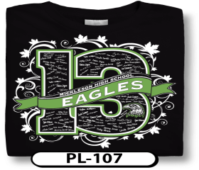 Each design template can be fully customized with your own text, mascots and ink colors. Further customization can include adding or deleting parts to any design such as deleting a mascot or adding a mascot to a non-mascot design.